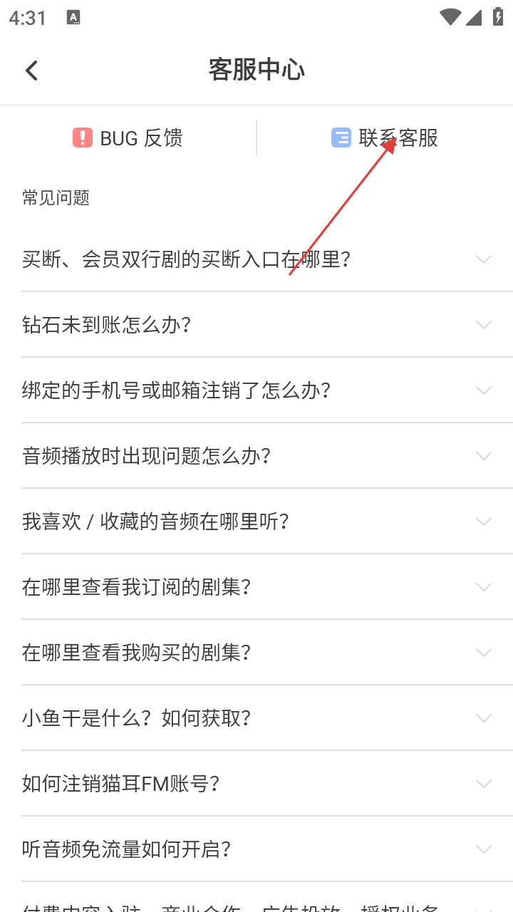 2、在个人中心页面,找到【联系客服】选项并点击,进入客服中心页面。