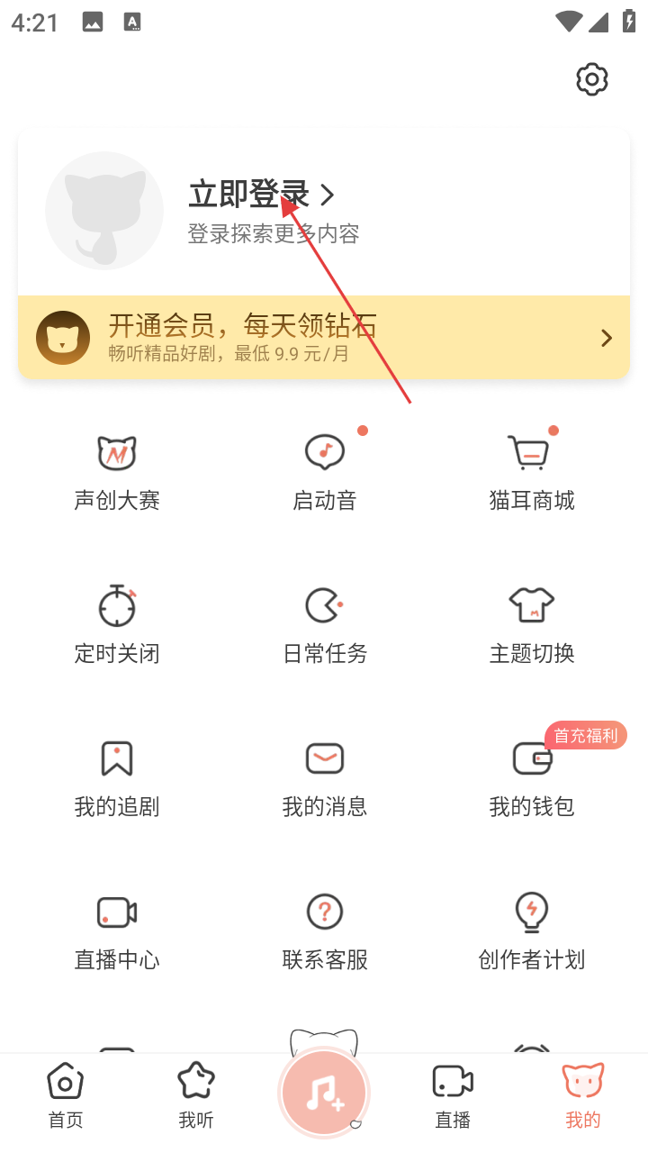 1、在猫耳FM首页,点击底部【我的】,进入个人中心页面,查看个人信息与功能入口。