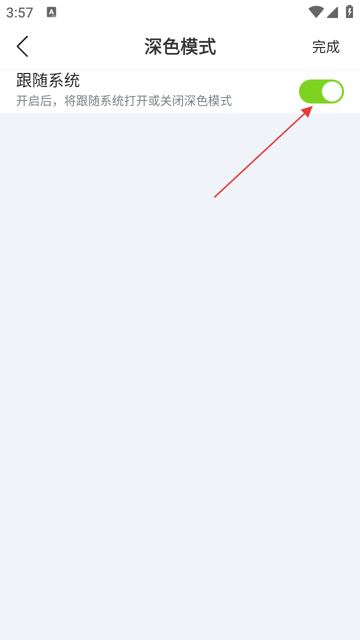 4、在深色模式设置页面,关闭【跟随系统】功能,点击【完成】按钮,即可应用深色模式设置。