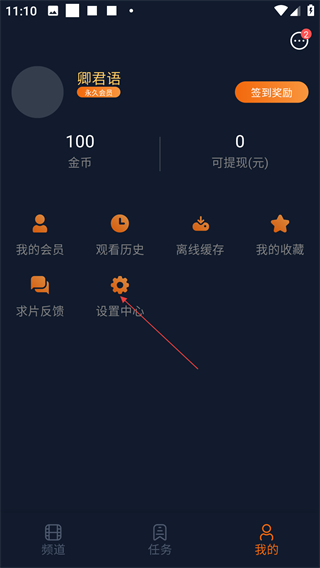 2、在个人页面,可查看金币、可提现金额,点击【设置中心】选项,进入应用的设置界面。