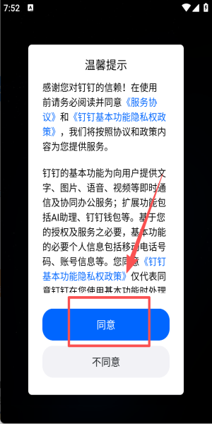1、阅读协议点击“同意”,授权手机号与账号信息用于即时通信及协同办公。