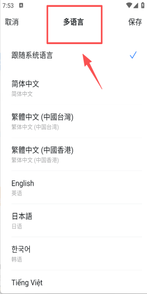 4、进入“多语言”选择简体中文或英语等,保存后即可切换界面语言。