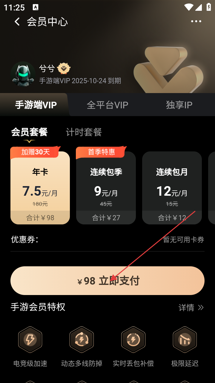 3、在会员中心页面,选择会员套餐,如【年卡】,点击【立即支付】按钮。