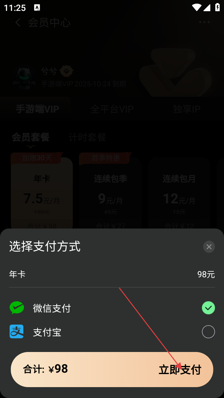 4、在支付方式选择页面,选择支付方式,点击【立即支付】按钮,即可完成会员续费,享受会员专属权益。