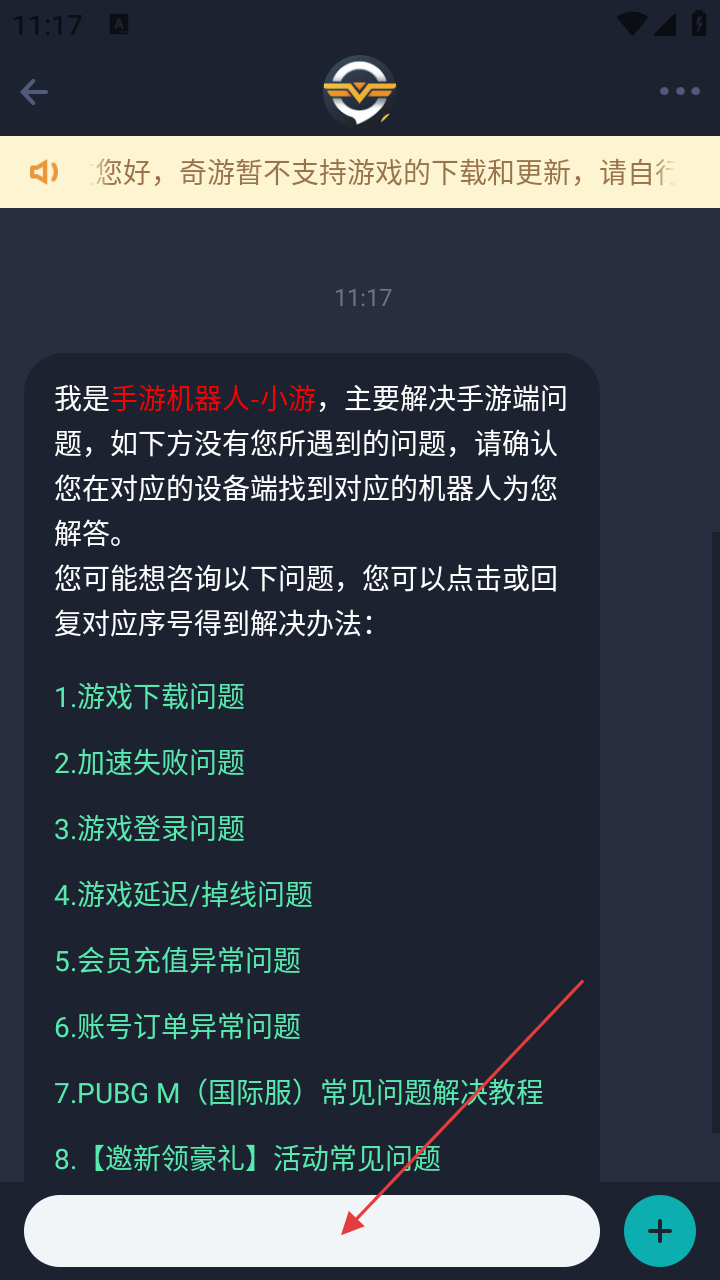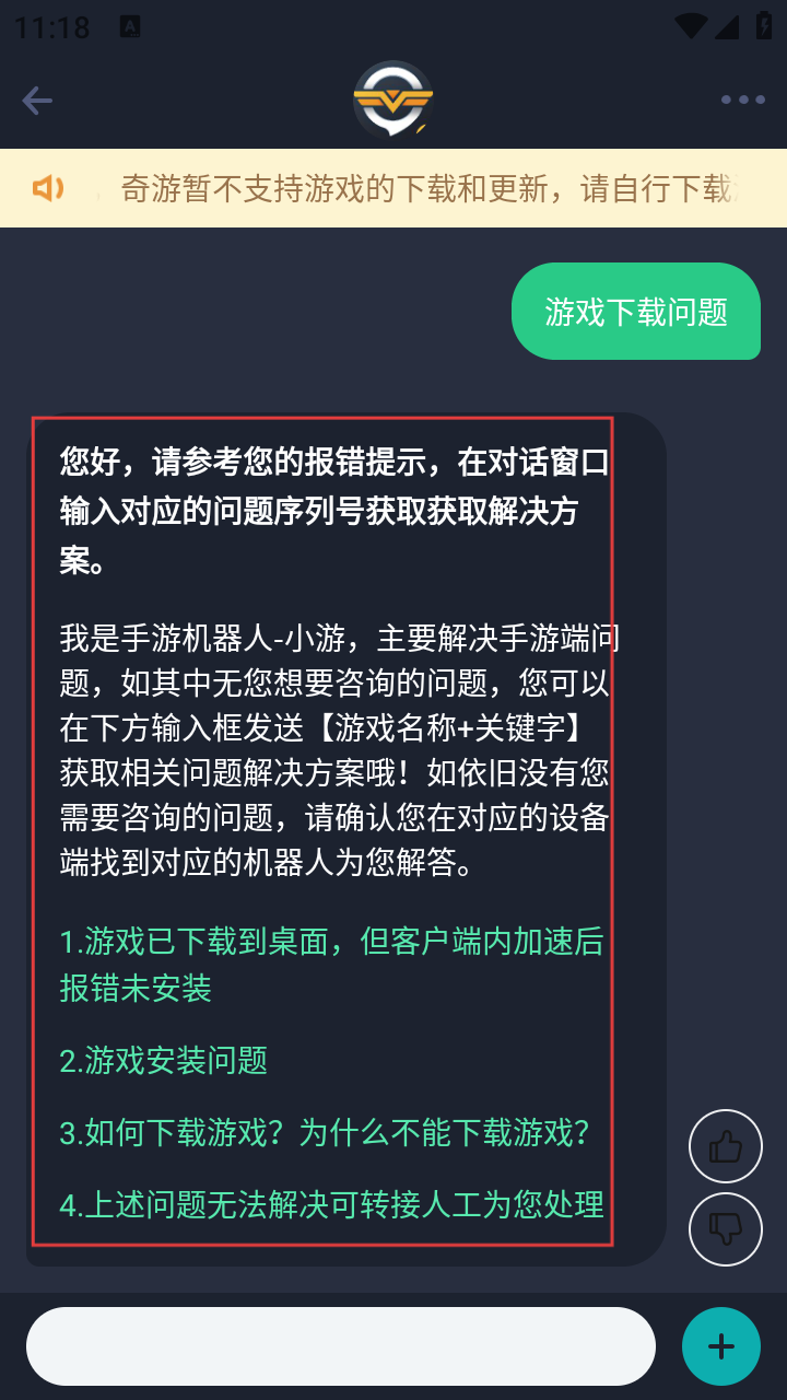3、在客服咨询页面,根据需求点击或回复对应问题序号,如【游戏下载问题】。
