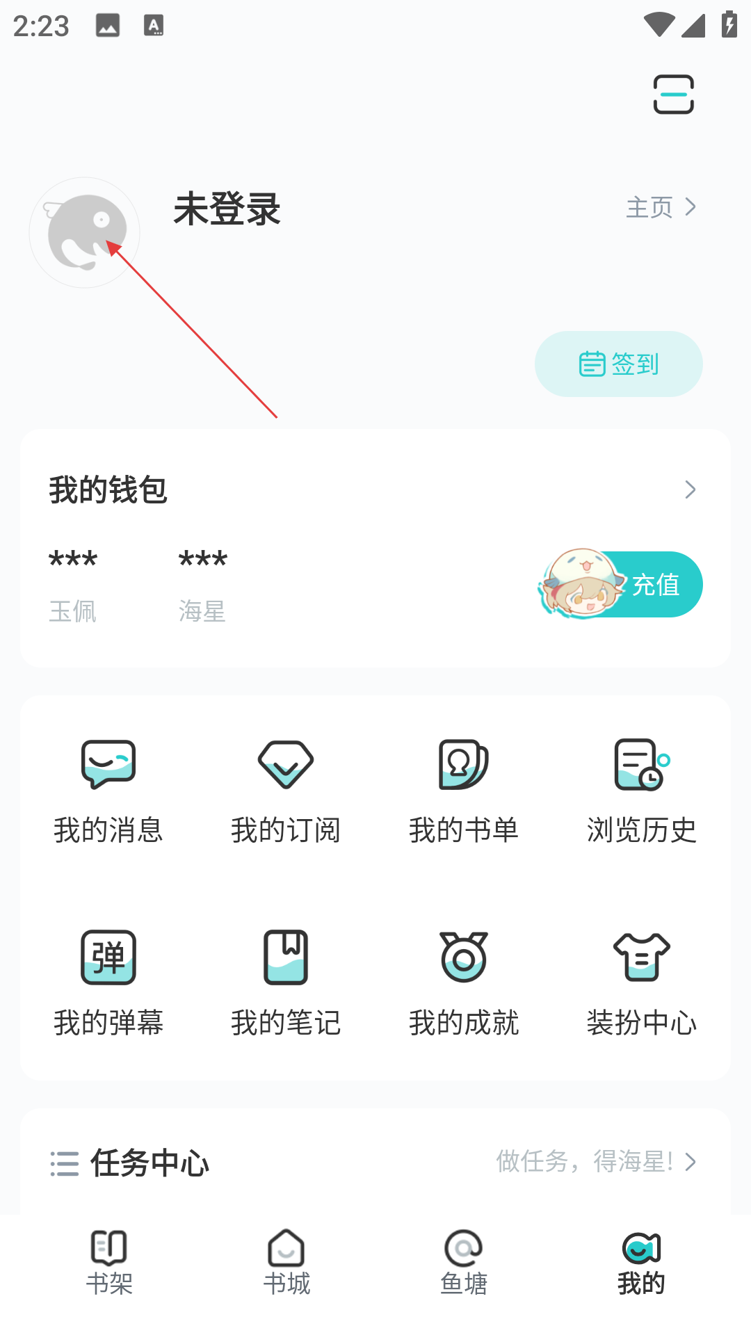 1、进入【长佩文学城】后,在书城界面点击右下角【我的】,进入个人中心页。