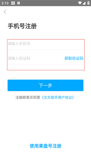 4、进入手机号注册页面,填写手机号、获取验证码后完成注册。
