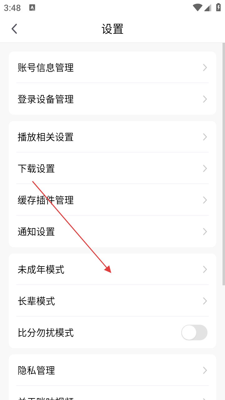 3、进入设置界面,有【账号信息管理】【登录设备管理】等选项,点击【未成年模式】可进入相关设置页。