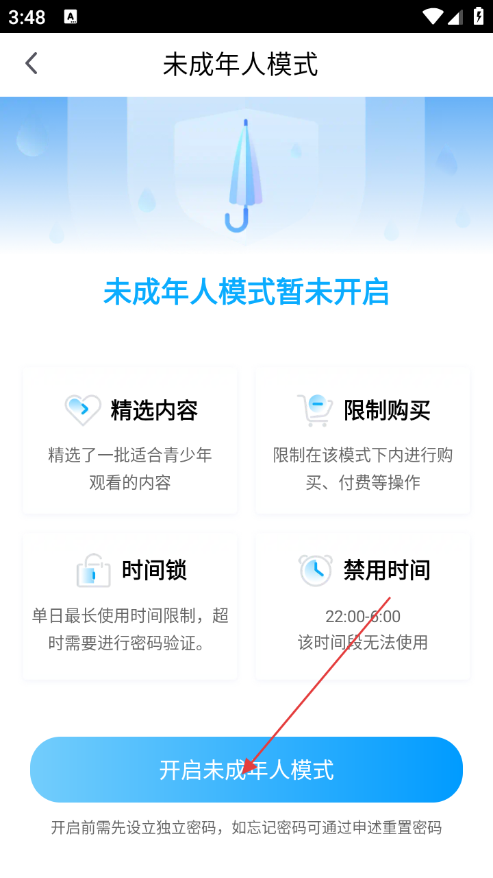 4、进入未成年人模式页面,介绍了精选内容等功能,点击【开启未成年人模式】按钮即可开启该模式。