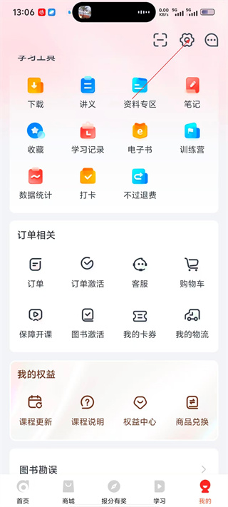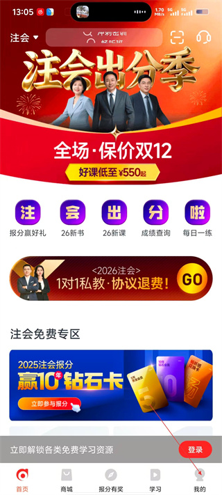 1、进入会计云课堂App首页,可参与报分赢礼、浏览课程活动等内容。