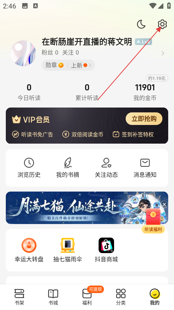 1、在七猫小说界面,点击底部【我的】,进入个人中心页面,可查看个人相关信息。