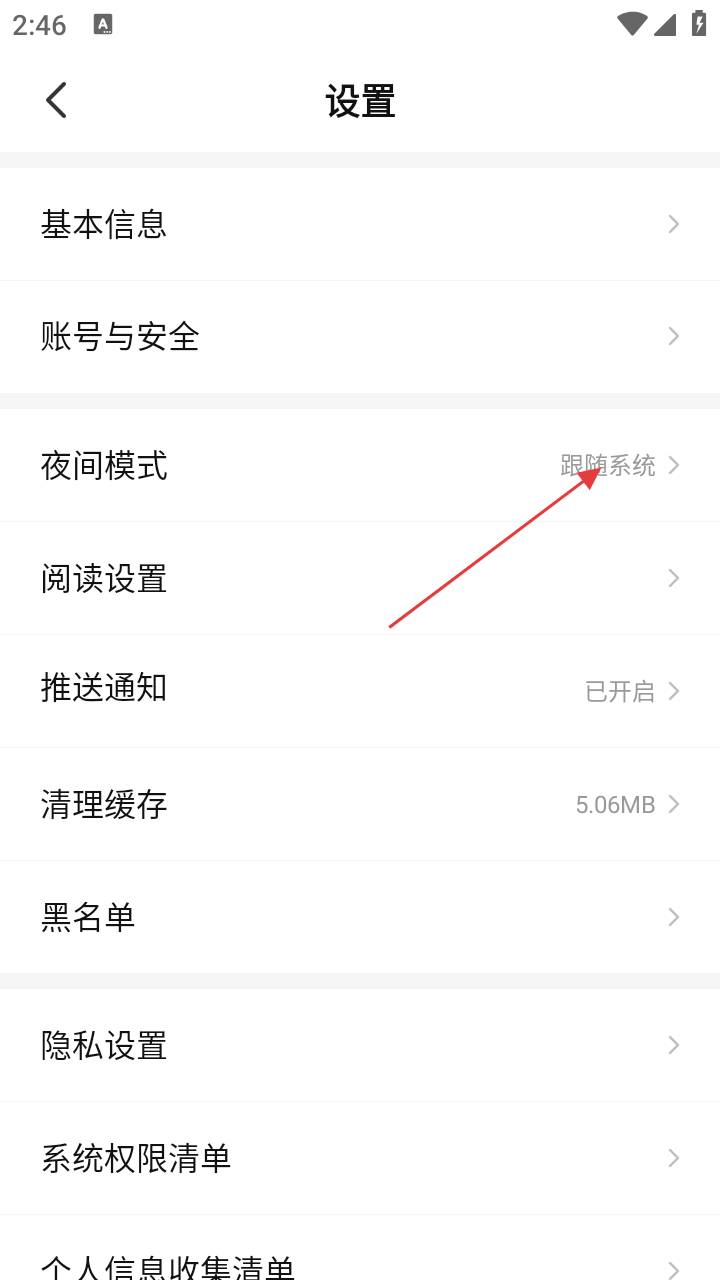 3、在设置界面,找到【夜间模式】选项,点击其右侧的【跟随系统】,弹出模式选择框。