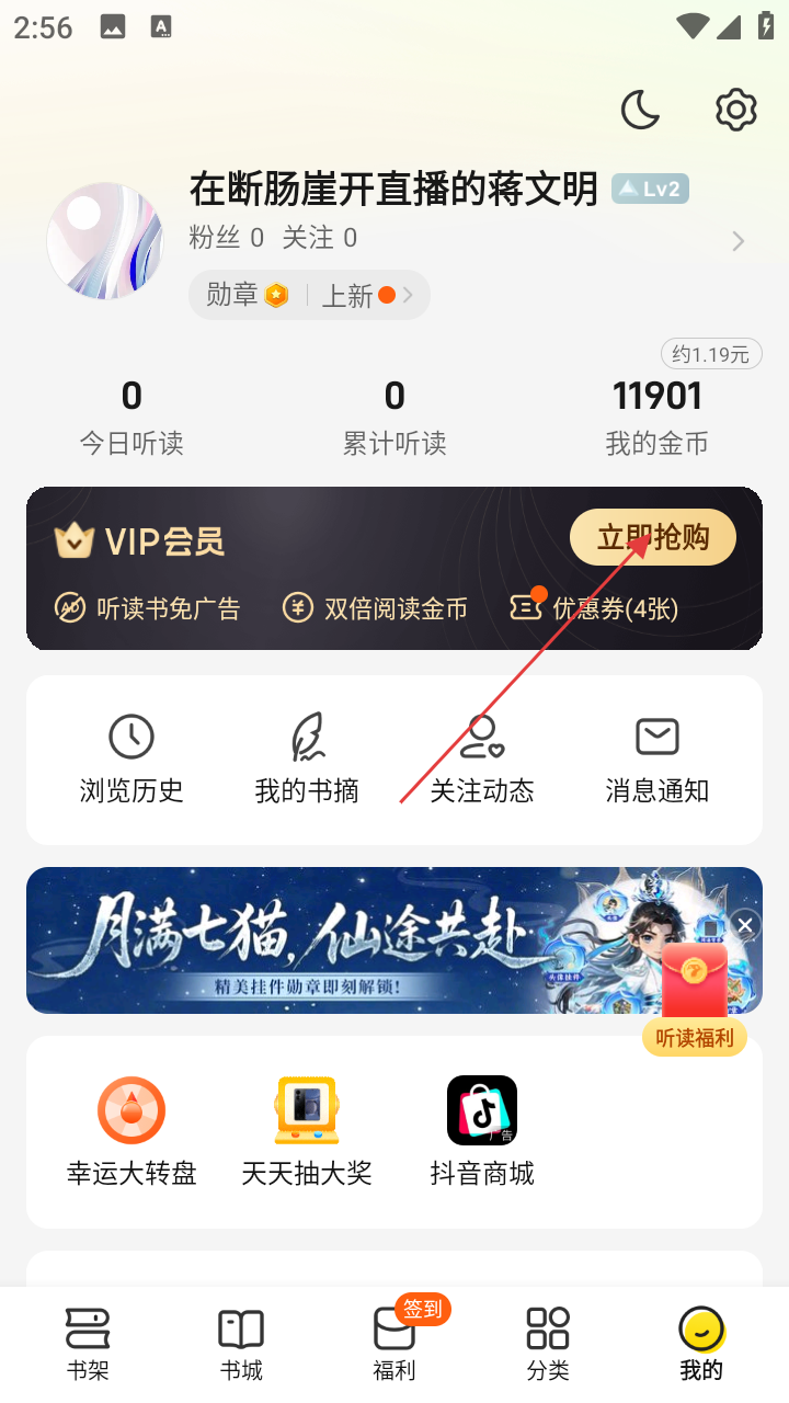 1、在七猫小说界面,点击底部【我的】,进入个人中心页面,可查看个人相关信息与功能。