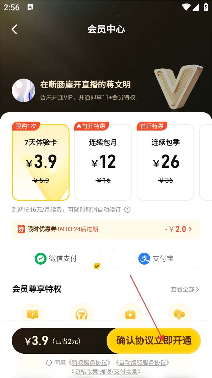 3、在会员中心页面,选择会员套餐后,点击【确认协议立即开通】按钮,触发支付提醒弹窗。