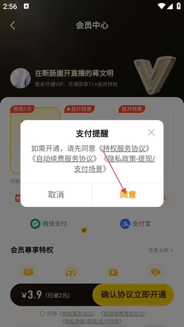 4、在支付提醒弹窗中,点击【同意】按钮,同意相关协议,即可进行会员开通支付流程。