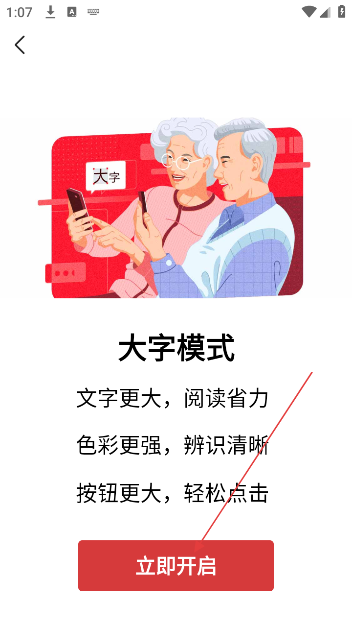 4、此外,设置里还有【大字模式】,开启后文字、按钮更大,色彩更强,阅读和点击更轻松,点击【立即开启】即可启用。