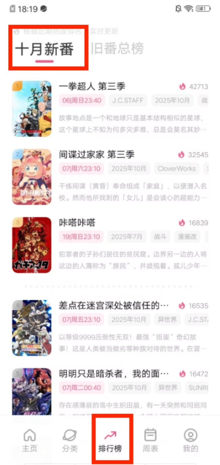 3、切换到 “排行榜” 页面,选择 “十月新番” 分类,查看近期热门动漫的热度与更新信息。
