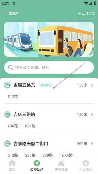 4.通过GPS定位,掌上出行公交可以准确地显示你所在位置附近的公交车站。
