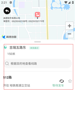 4、在站点详情界面,查看该站点的公交线路(如512路)、距离及发车状态等信息。