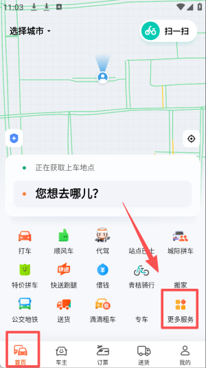 1、选择服务类型:在首页点击“更多服务”选择需要的出行或物流服务。