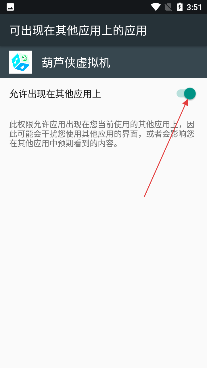 4、在画中画权限设置页面,开启“允许出现在其他应用上”的开关,即可启用画中画功能,让虚拟机在浮动小窗口中运行。