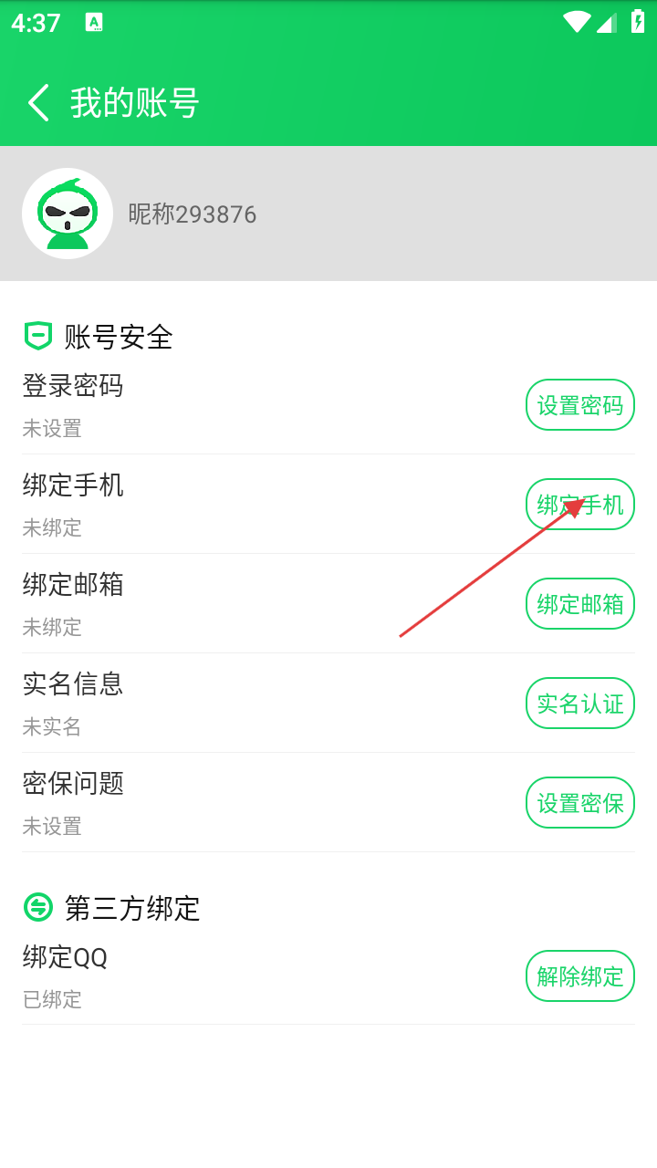 3、在账号安全设置页面,点击【绑定手机】选项,可进入绑定手机页面。