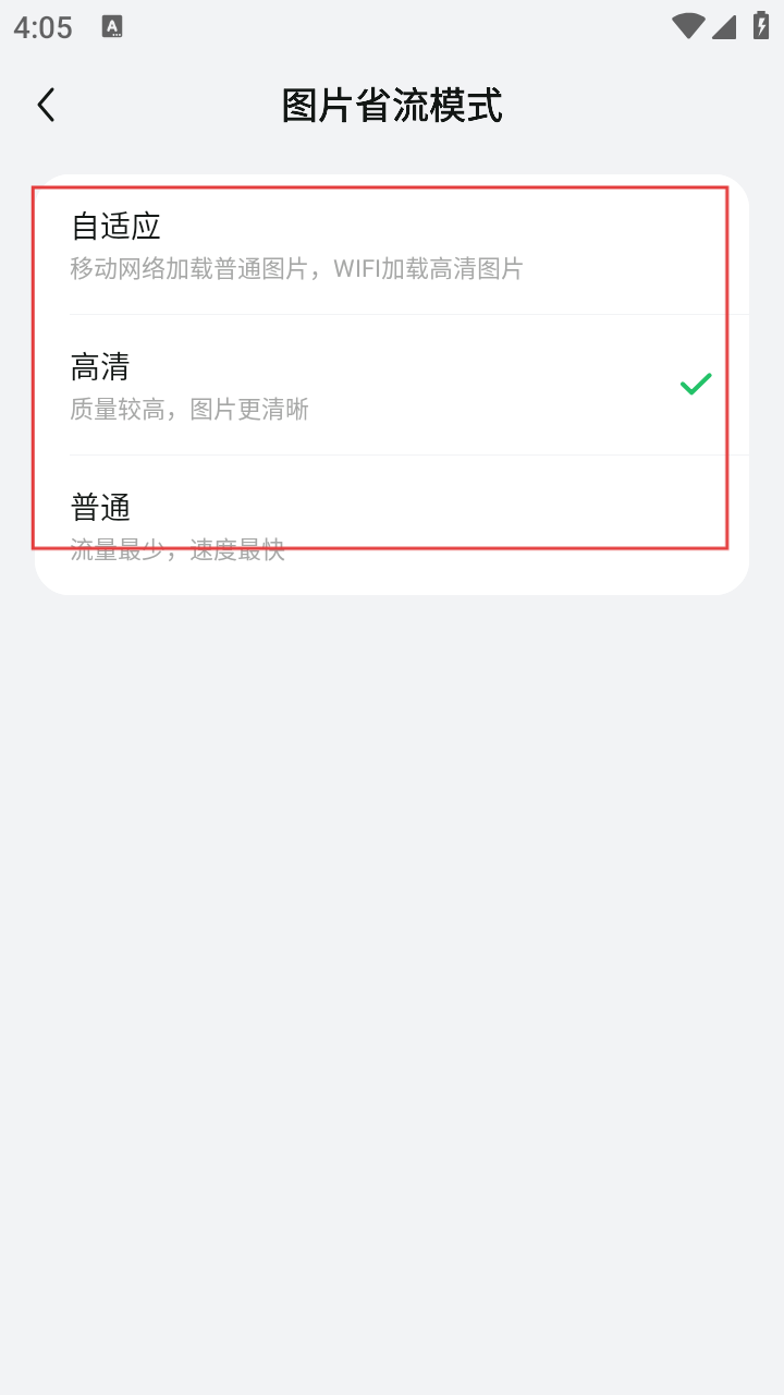 4、进入图片省流模式页面,可根据需求选择【自适应】【高清】或【普通】模式,当前选中的是【高清】模式。