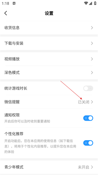 3、设置页面中,选择【微信提醒】选项(当前状态为“已关闭”),进入对应界面。