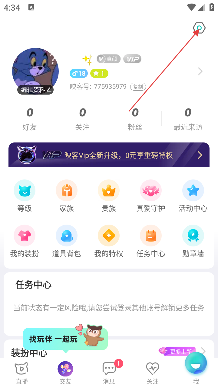 2、进入个人页面后,点击右上角设置图标,进入设置页面。