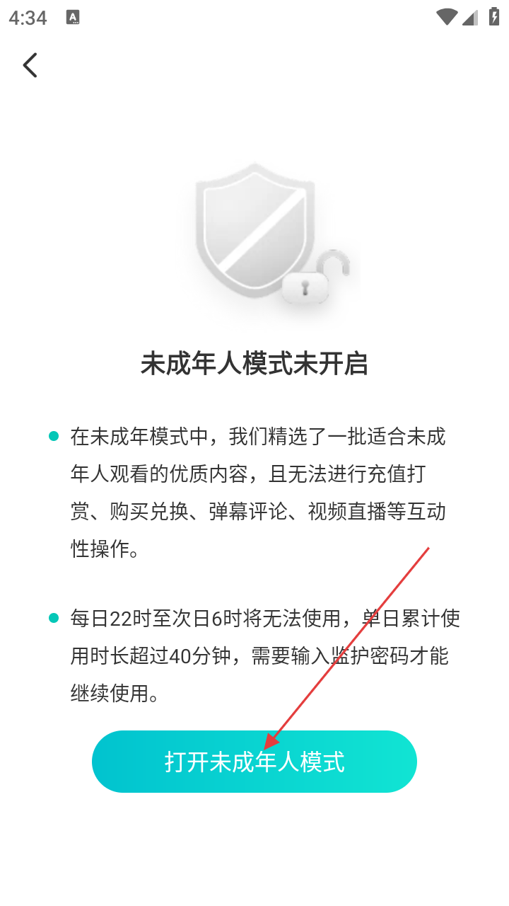 4、在未成年人模式设置页面,点击【打开未成年人模式】按钮,即可开启该模式。
