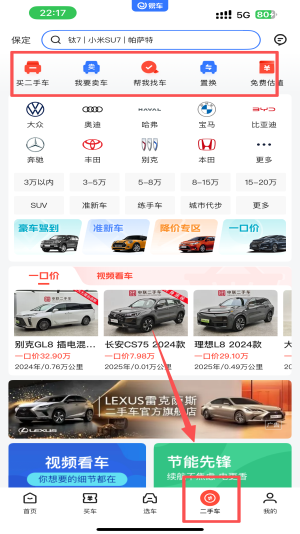2、选择车型:在首页点击“新车”或“二手车”选项,选择您想要的车型。