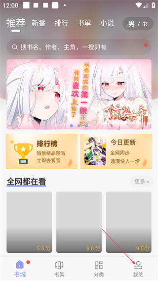 1、打开应用进入书城页面,可浏览推荐漫画、排行榜等内容,点击底部【我的】进入个人页面。