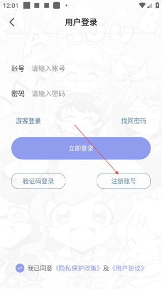 3、在用户登录界面,可选择账号密码登录、验证码登录等方式,点击【注册账号】进入账号注册页面。