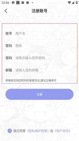 4、在注册账号页面,依次填写用户名、密码、邮箱,勾选同意协议后点击【注册】完成账号创建。