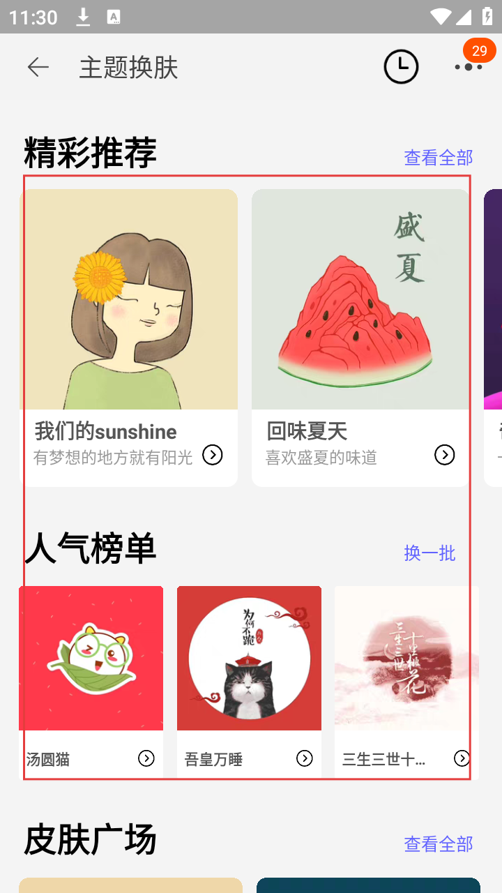 4、在主题换肤页面,可从【精彩推荐】【人气榜单】等板块选择喜欢的皮肤进行更换。