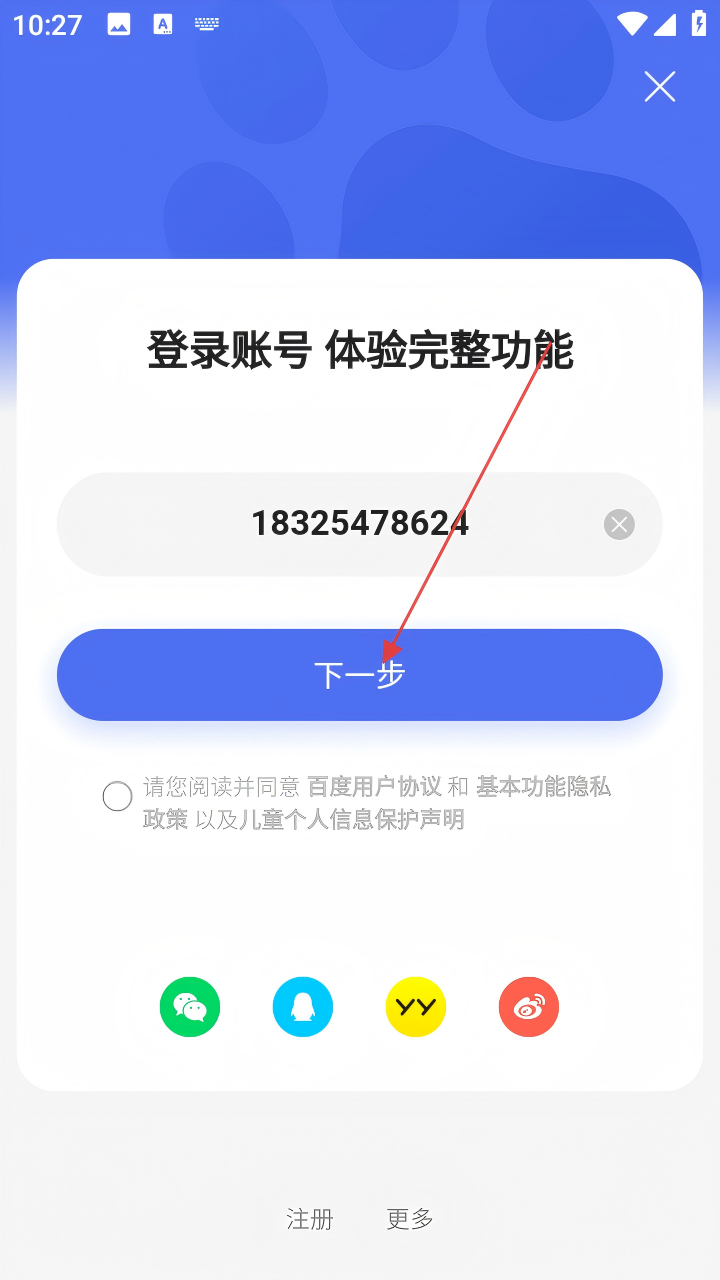 4、输入完手机号后,点击【下一步】,继续后续登录流程。