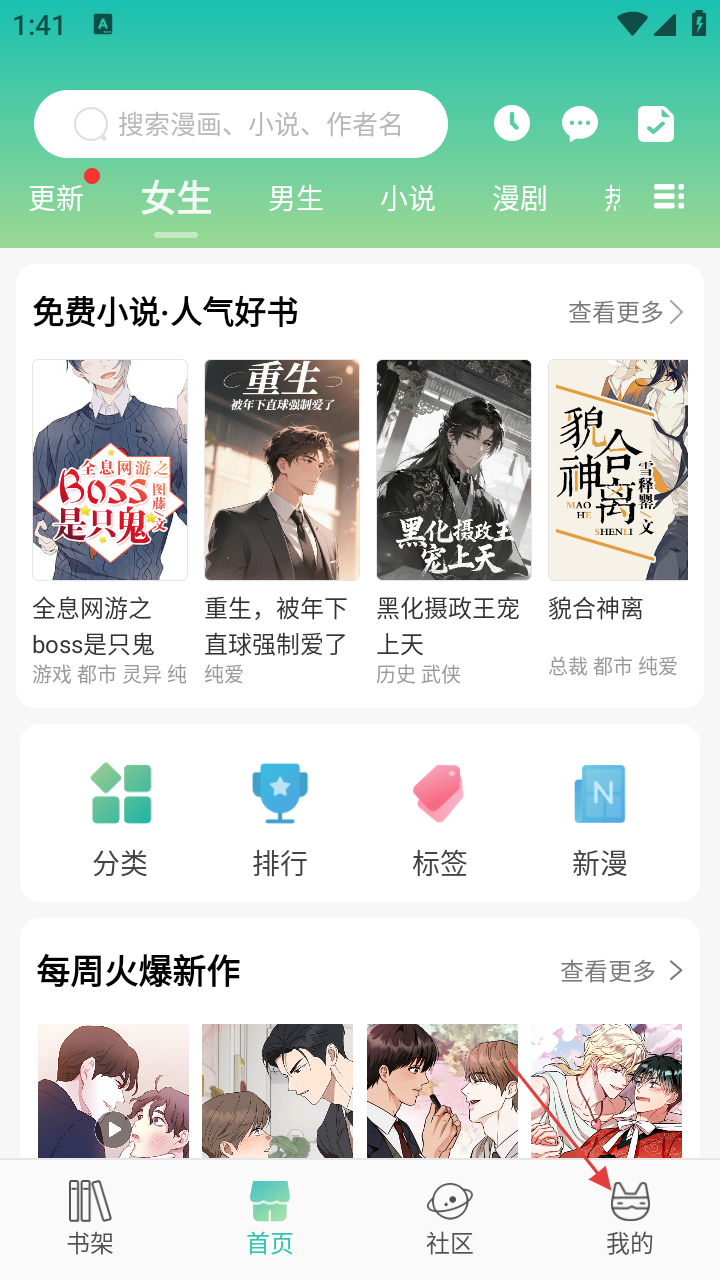 1、在软件首页,可搜索漫画、小说、作者名,浏览免费小说和每周新作,还能通过分类、排行等功能找内容,点击【我的】进入个人页面。
