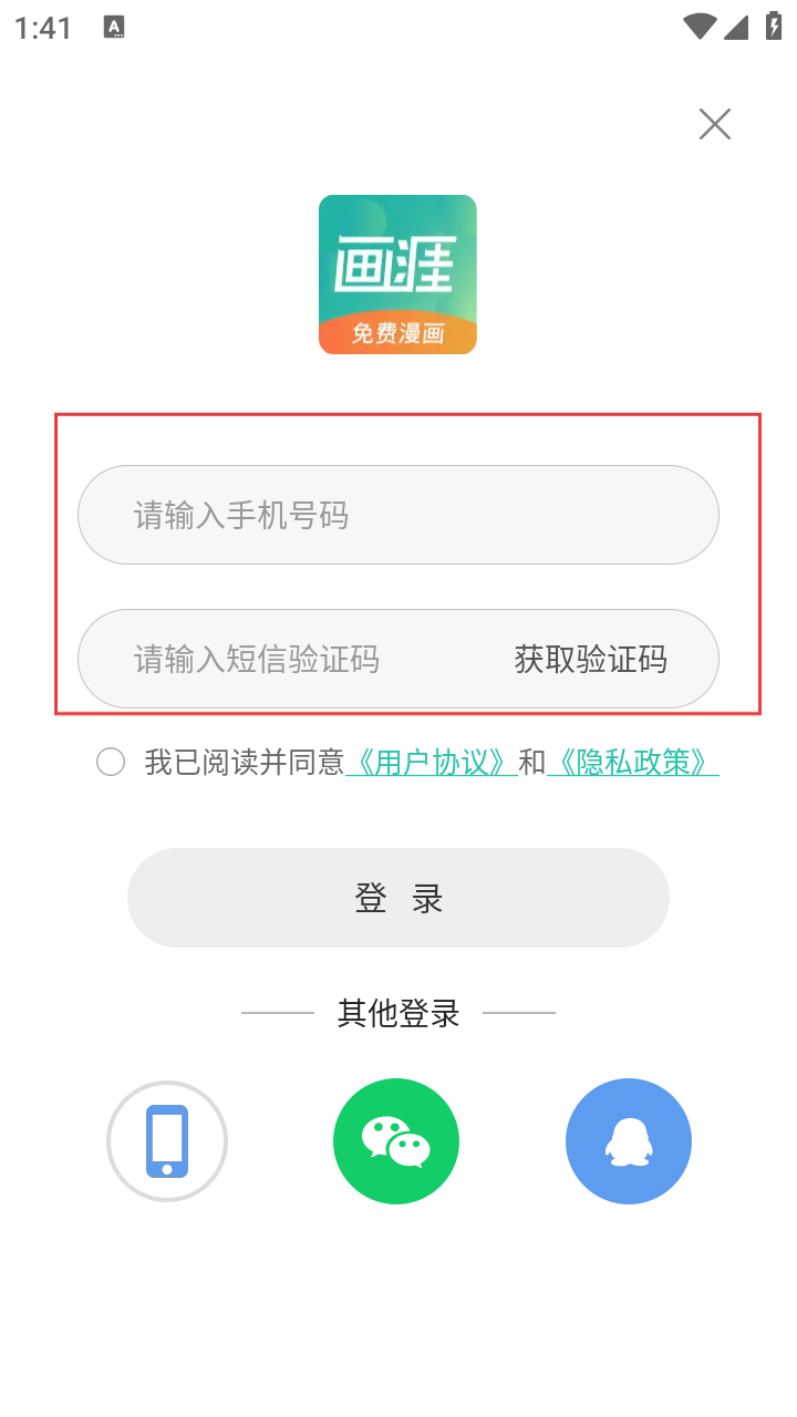 3、在登录界面,可输入手机号码和短信验证码,勾选同意协议后点击登录,也可选择微信、QQ等其他登录方式。