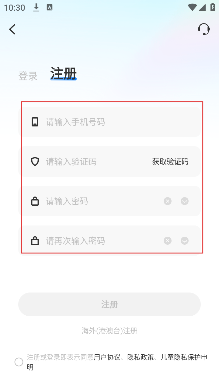4、在注册页面,依次输入手机号码、获取并输入验证码、设置密码,点击【注册】按钮即可完成账号注册流程。