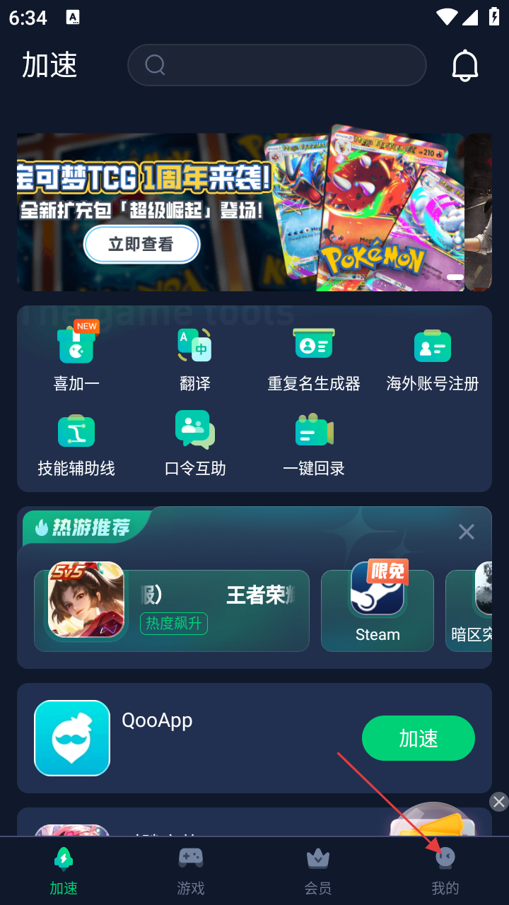 1、在【迅游加速器】加速界面,点击右下角【我的】,界面展示有热游推荐、辅助工具等功能入口。