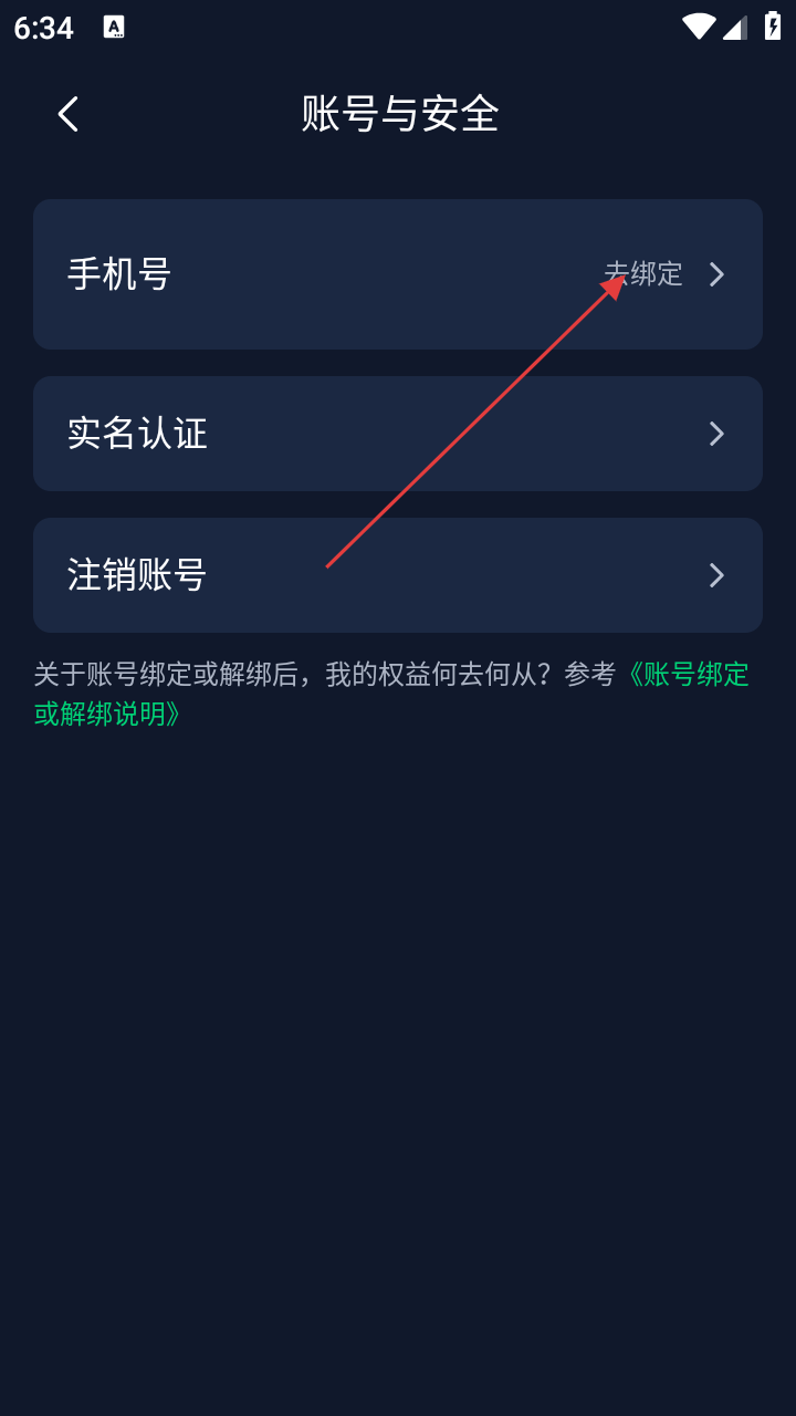 4、在【账号与安全】界面,可进行【手机号】绑定、实名认证及账号注销操作,保障账号安全。