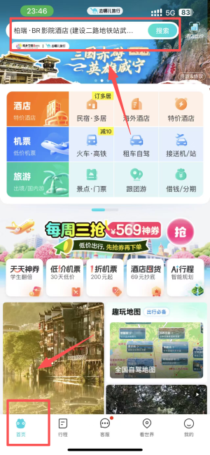 1、点击首页的“酒店”或“旅游”选项,开始预订酒店或旅游服务。