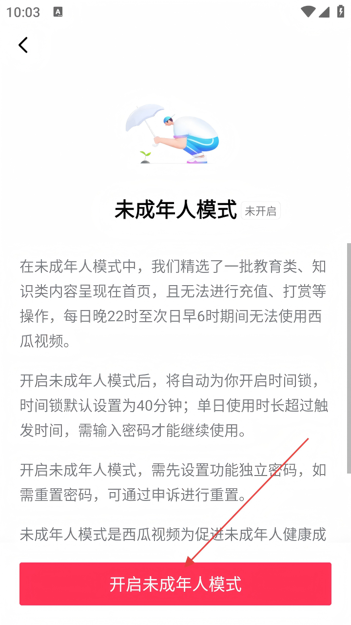 4、进入未成年人模式页面后,点击【开启未成年人模式】按钮,按照提示完成后续开启操作。