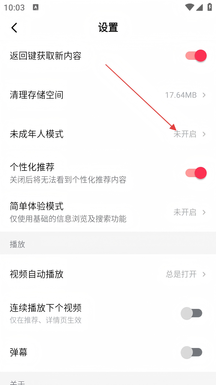 3、在设置页面,找到【未成年人模式】选项,此时显示为“未开启”,点击该选项。