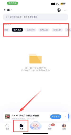 2、在文件页面,点击顶部的“分类”选项,选择“我的资源”来查看和管理你的文件。