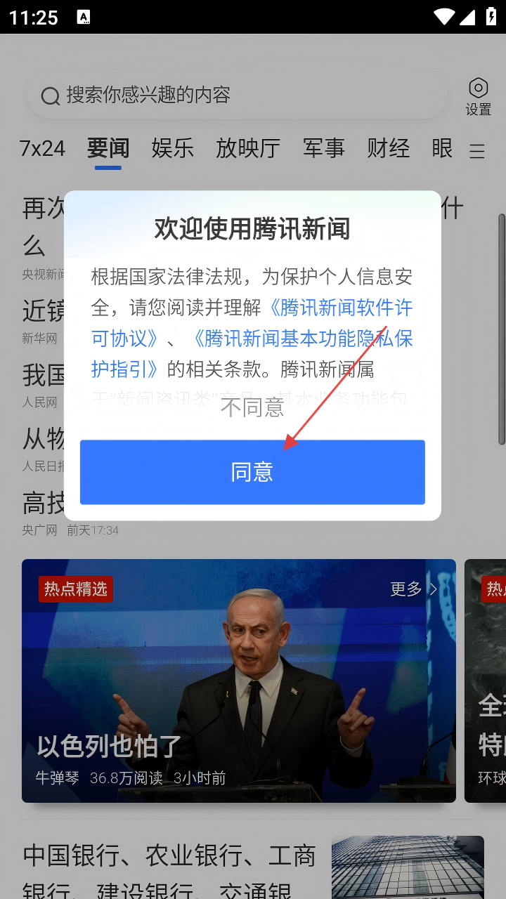 1、打开腾讯新闻APP,在弹出的“欢迎使用腾讯新闻”页面,点击【同意】。