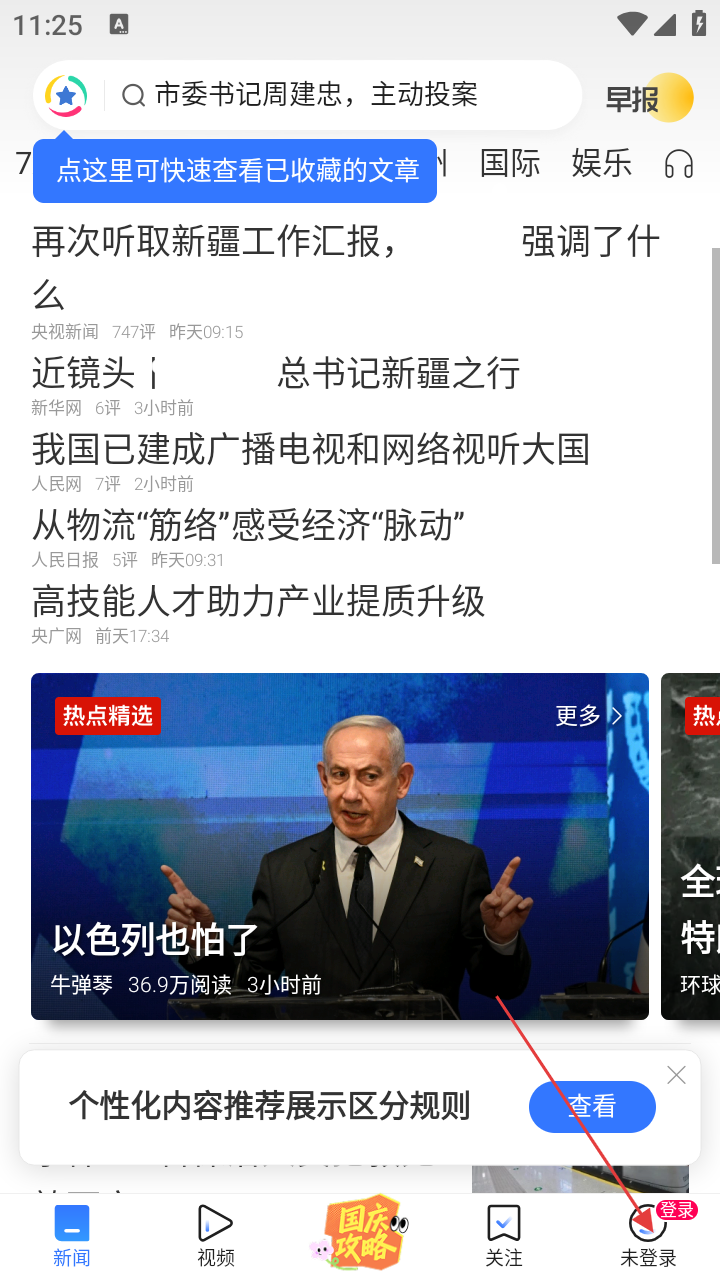 2、进入腾讯新闻首页后,点击右下角的【未登录】,弹出登录方式选择页面。
