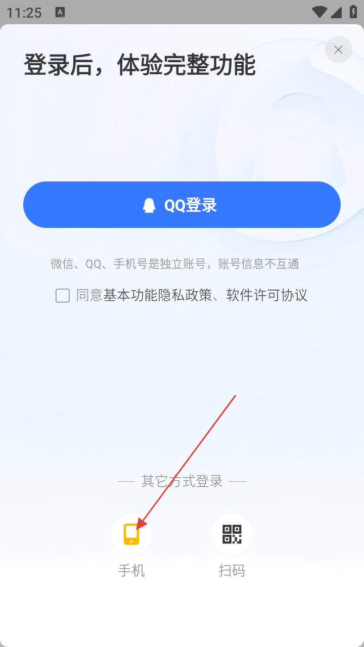 3、在登录方式选择页面,点击【手机】,进入手机号登录页面。