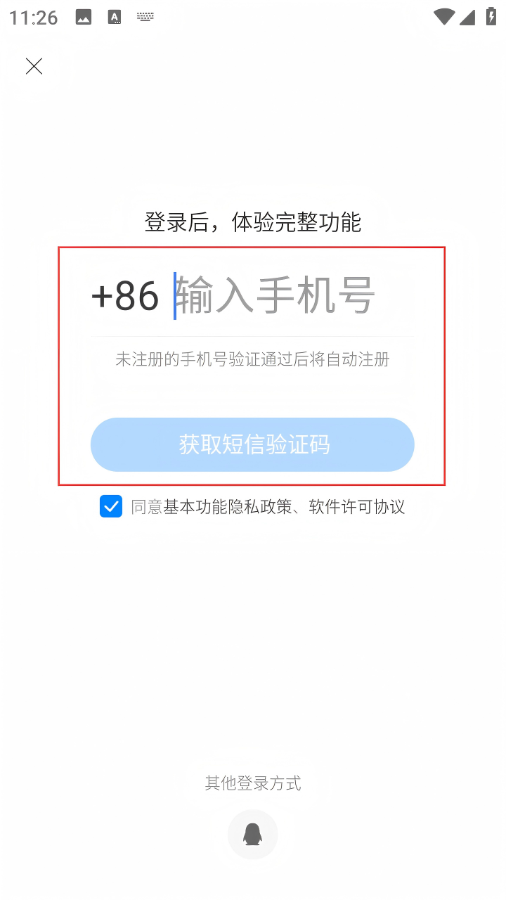 4、在手机号登录页面,输入手机号码,点击【获取短信验证码】,输入收到的验证码,完成登录。