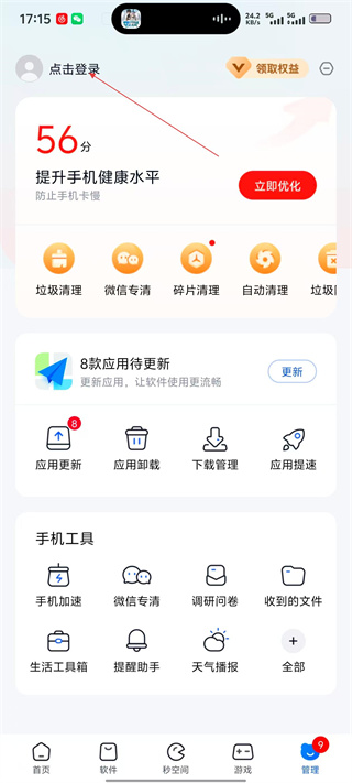 2、进入管理界面后,点击“点击登录”区域可进入账号登录流程,同时能使用垃圾清理、应用更新等工具类功能。